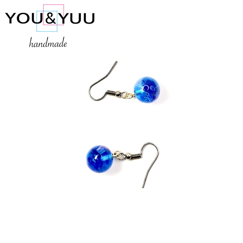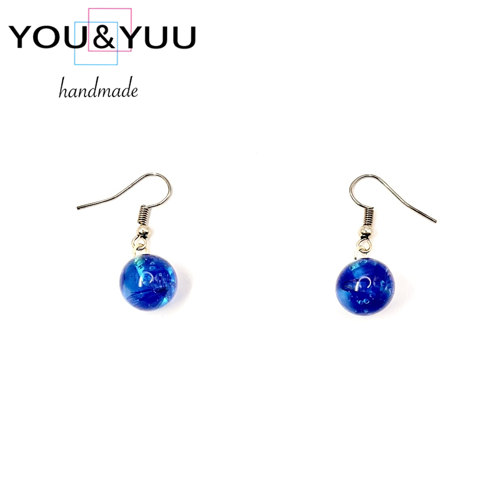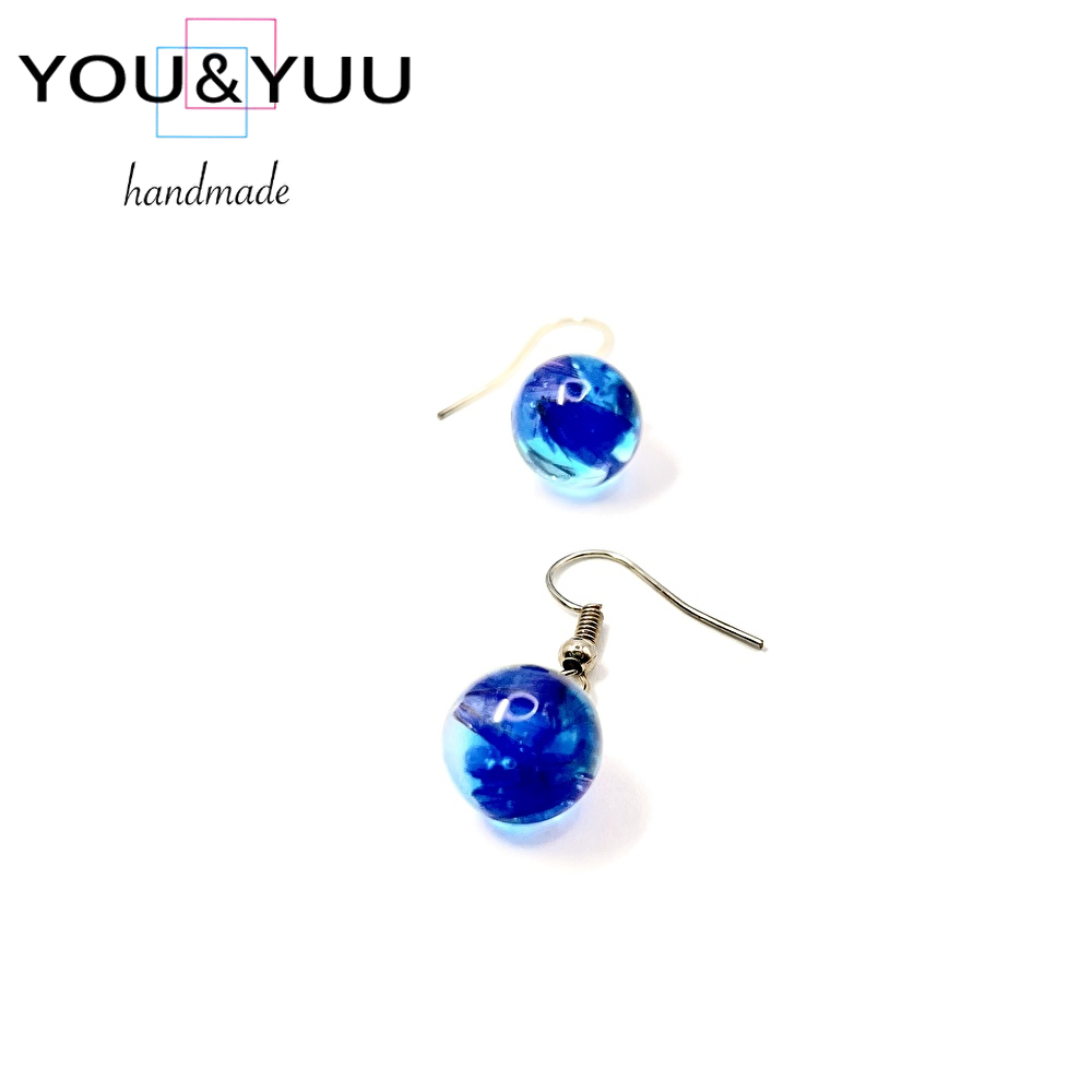 【特長】球体レジンの中に深く澄んだラピスラズリ風のブルーが閉じ込められ、まるで深海の一滴を耳元に宿したよう。光を受けるたびに、静かな輝きと奥行きを感じさせる神秘的なピアスです。
