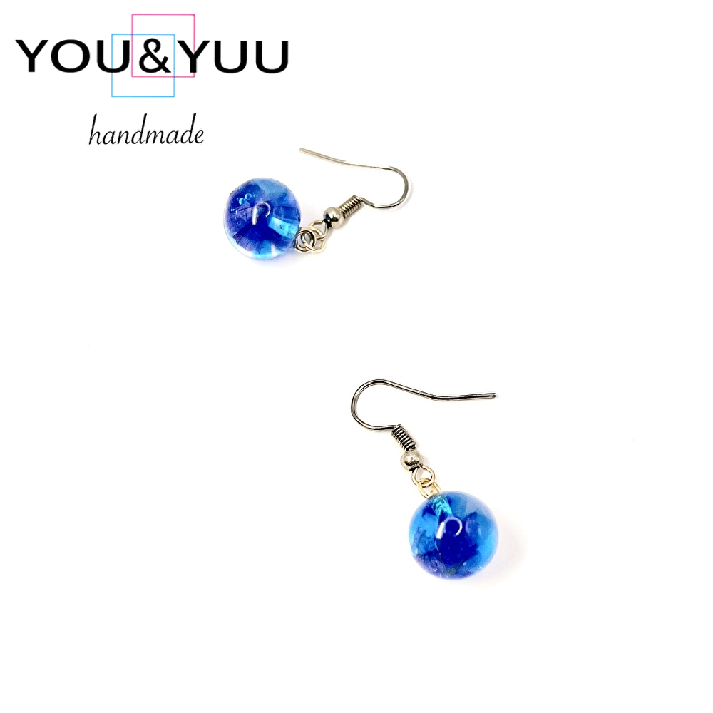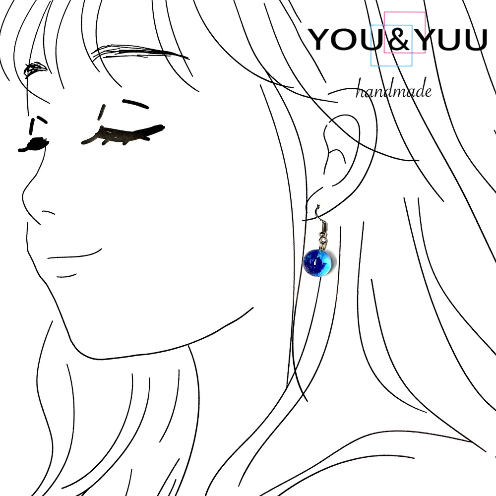 透明感あふれる球体にラピスラズリのようなブルーが閉じ込められ、耳元で静かに輝きます。