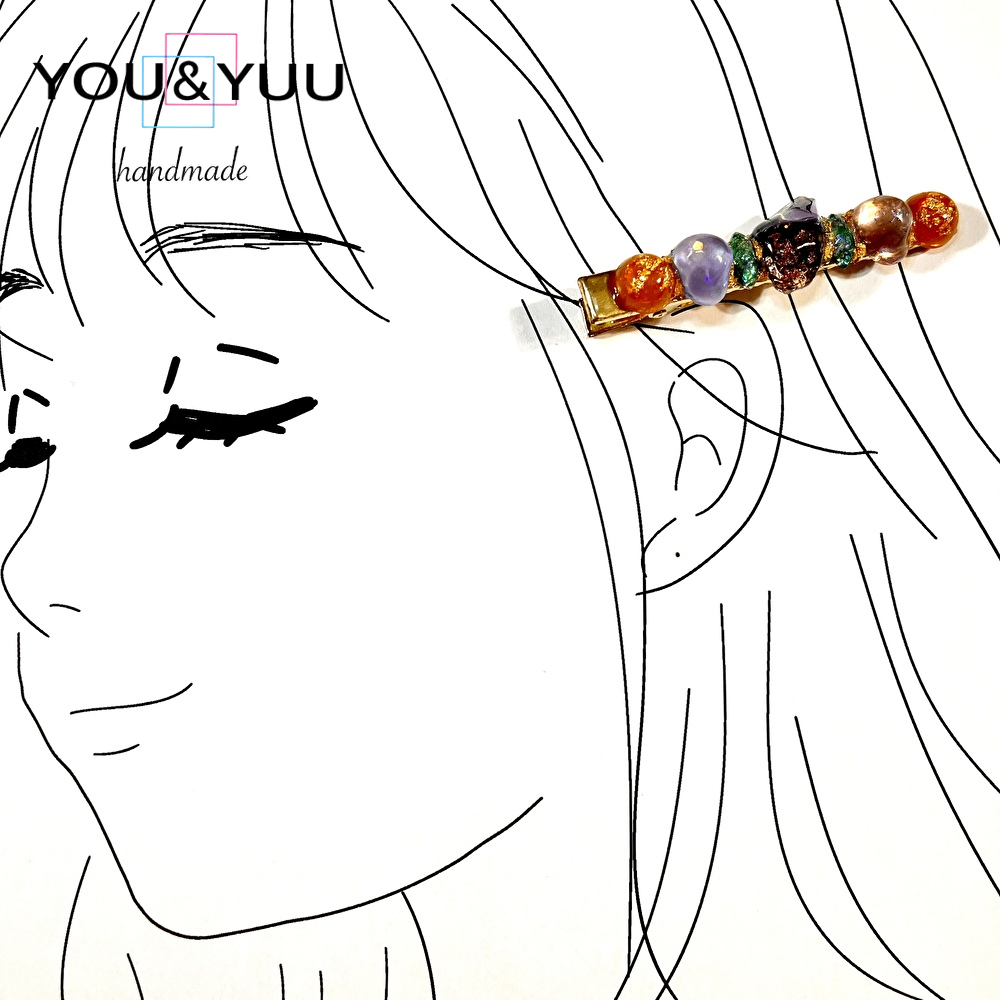 中央のミステリアスなアメジストカラーのレジンパーツが目を引く、アーティスティックな一品。 両端のアンバー(琥珀)色のレジンが暖かみを添え、大人の女性に似合う上品な彩りを髪にプラスします。
