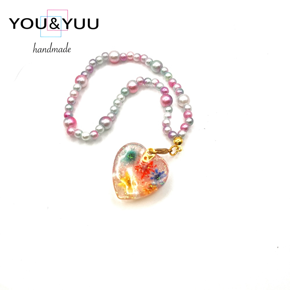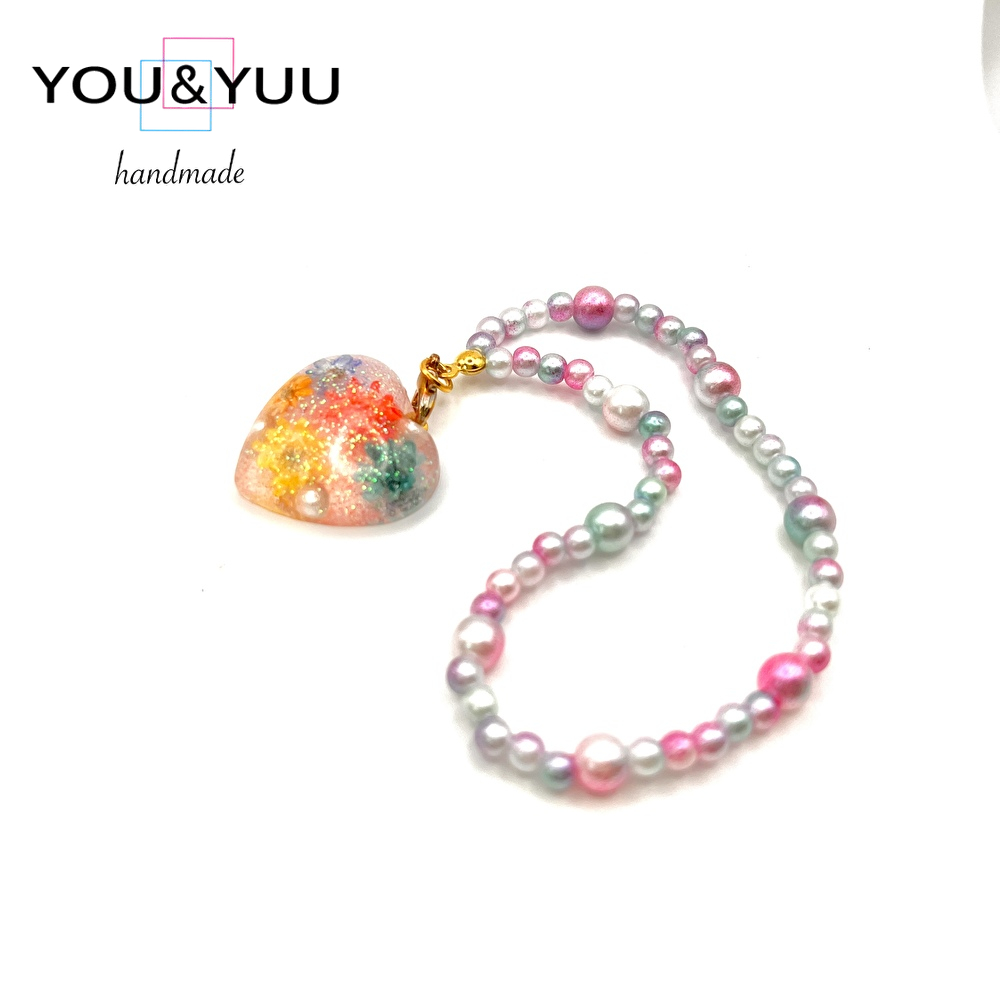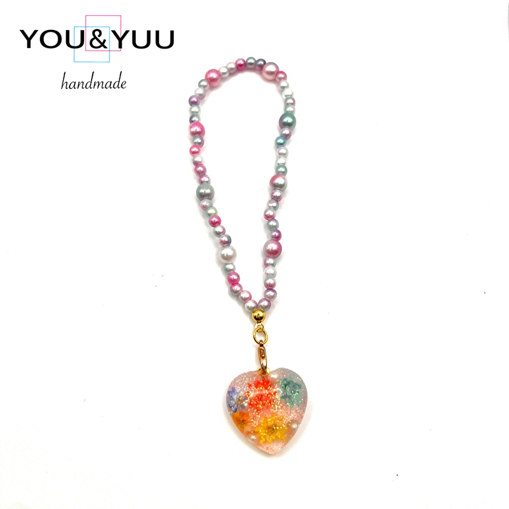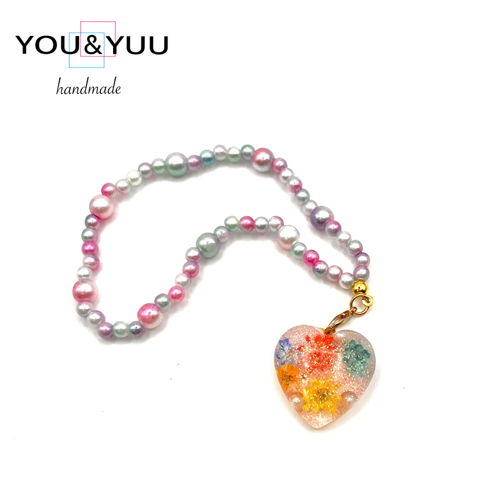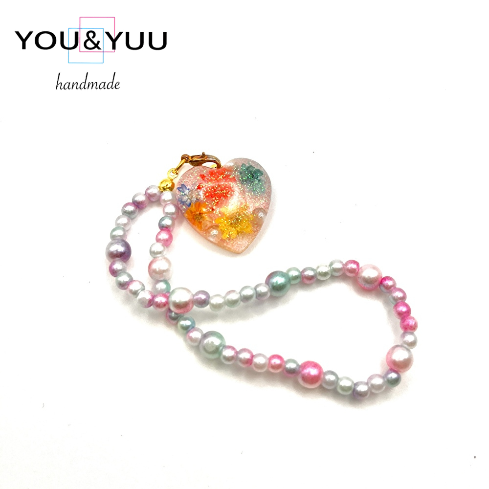 【特長】ハート形にラメ、ドライフラワー、コットンパールを入れてパールビーズで仕上げました
