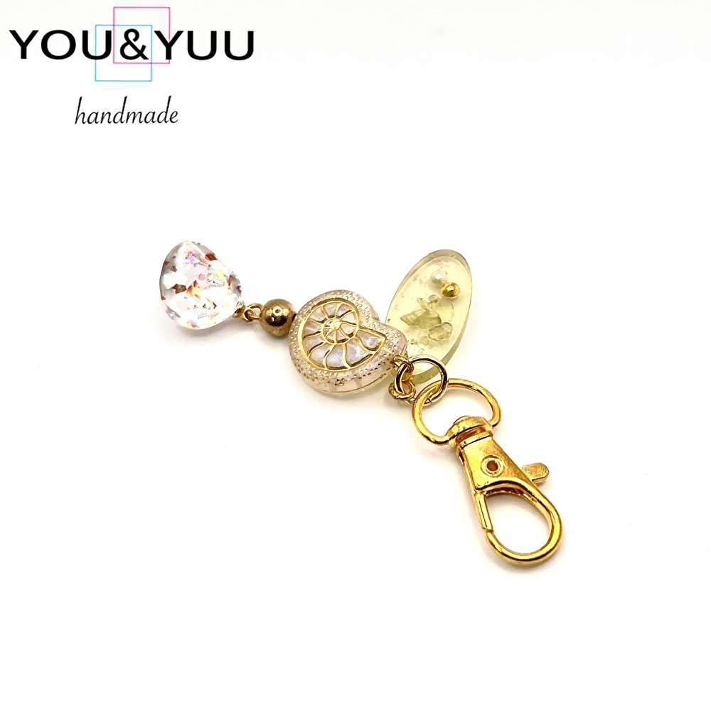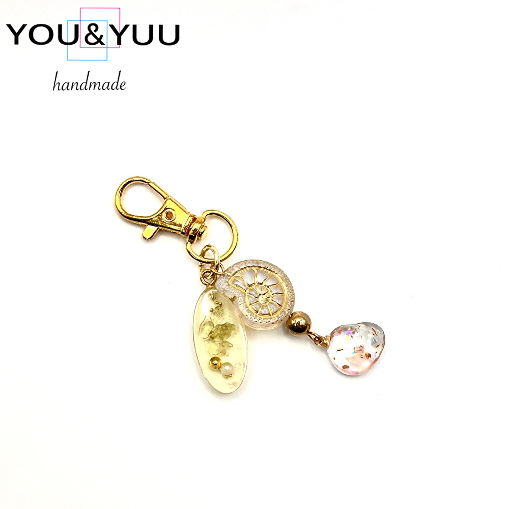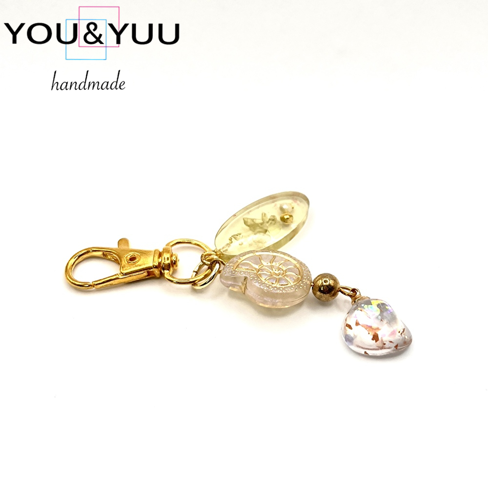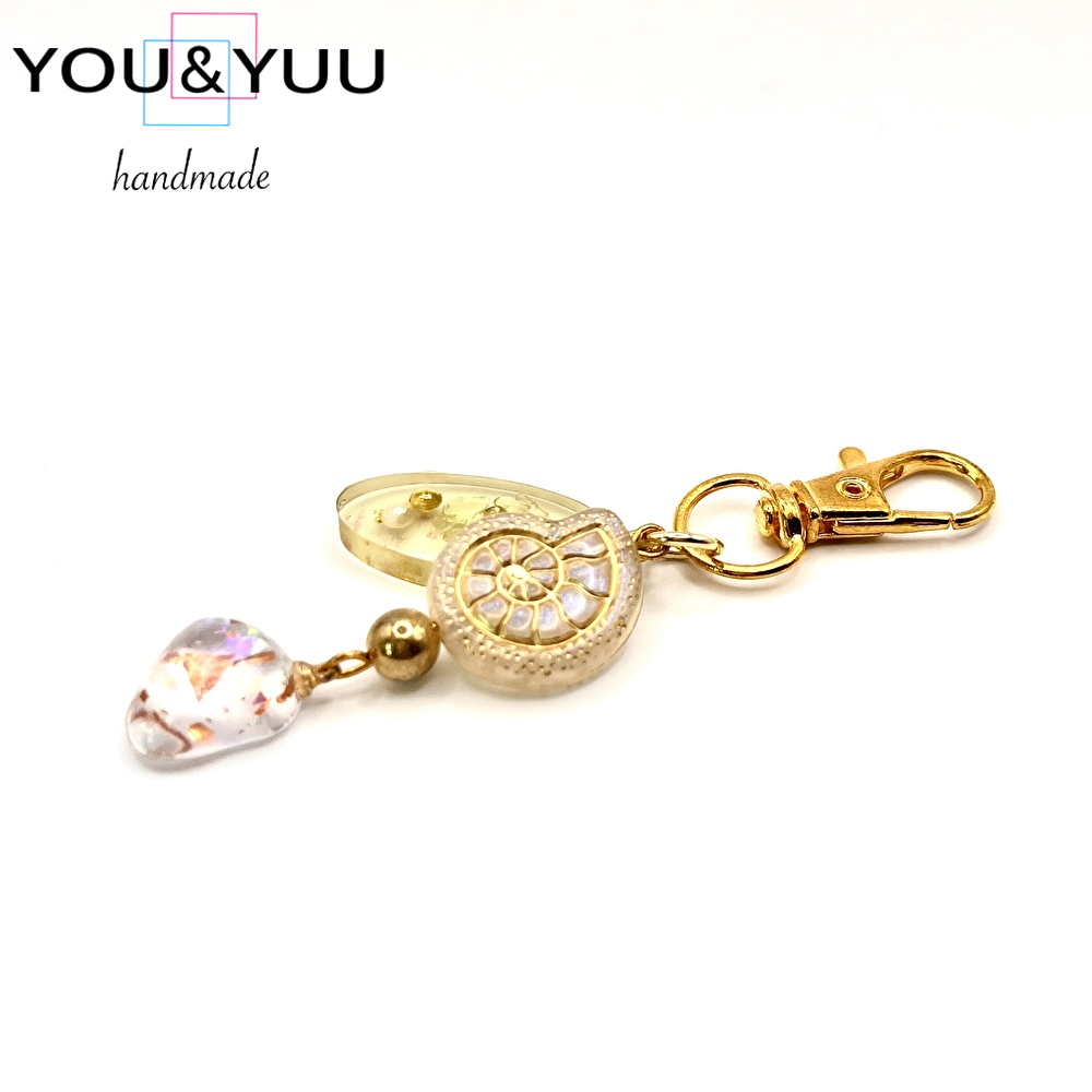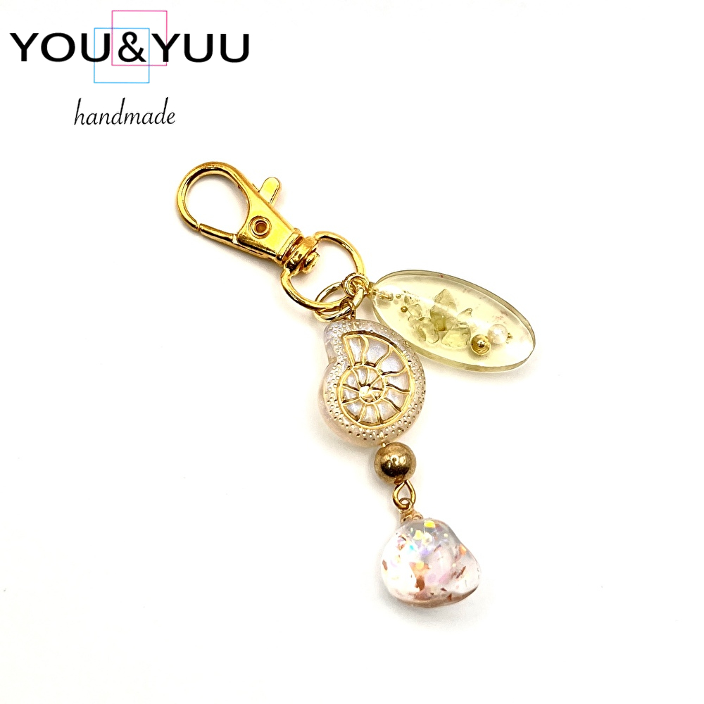 ゴールドフレーム アンモナイト&オーロラチャーム / レジンキーホルダー / Ls 213