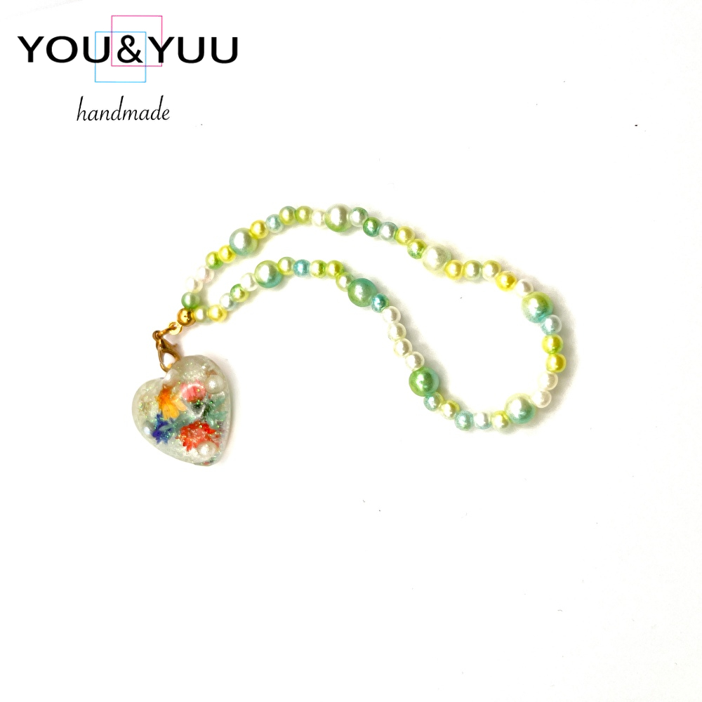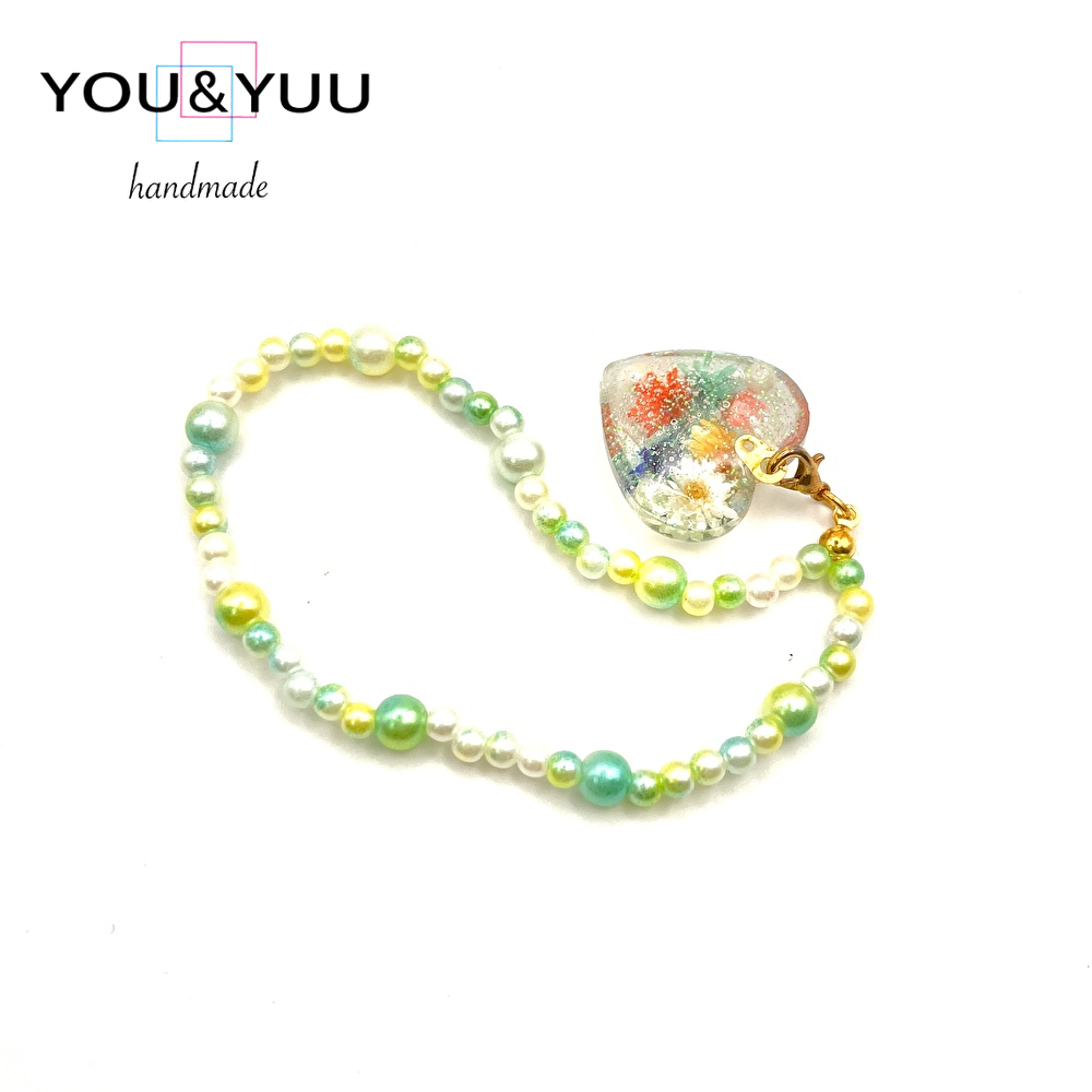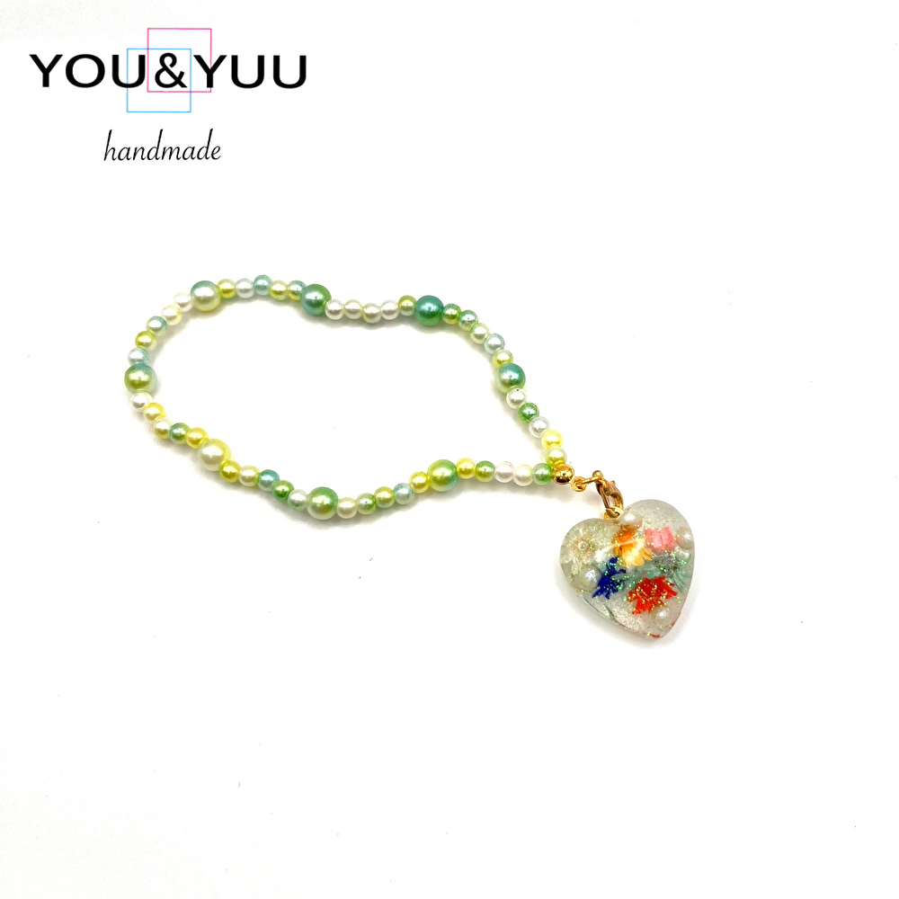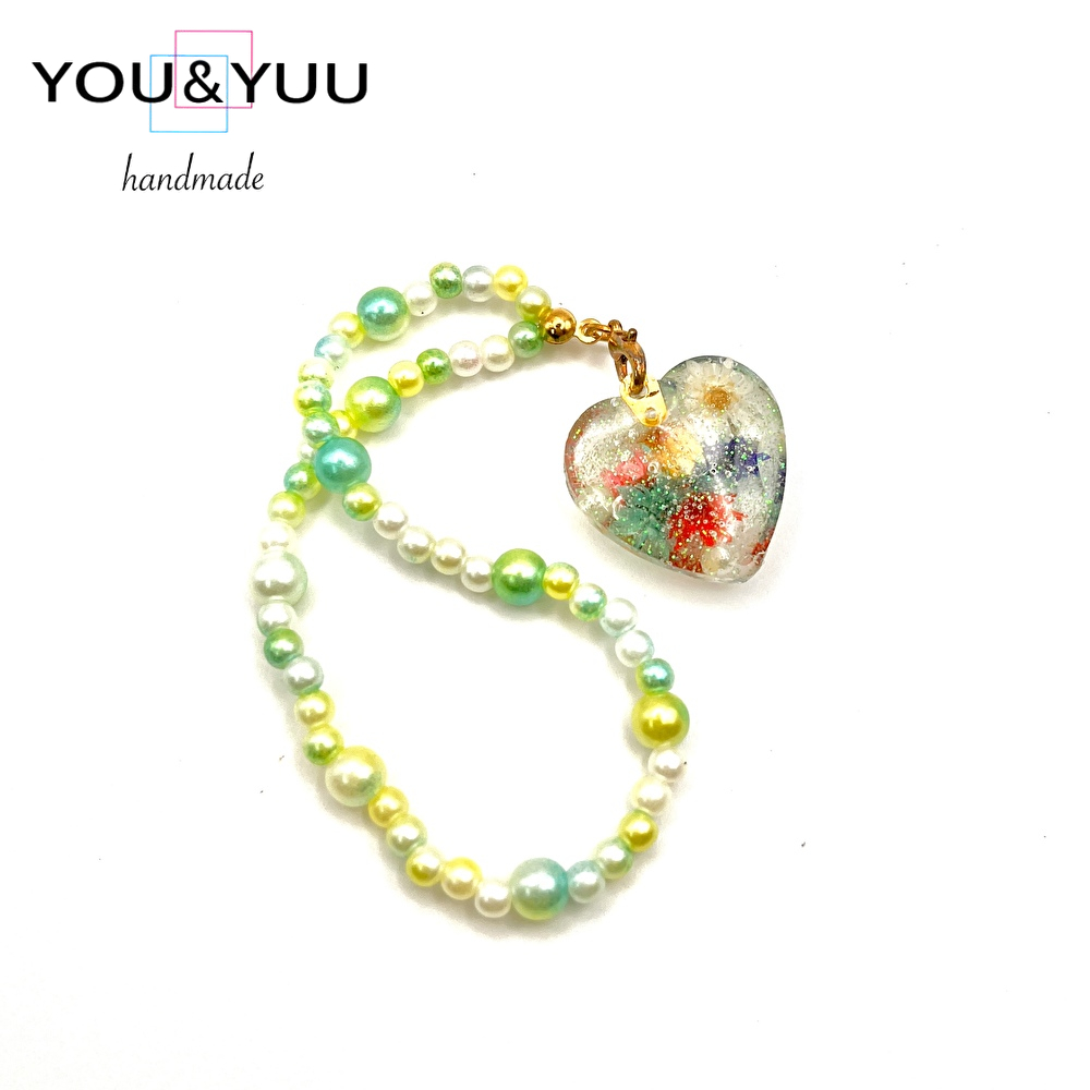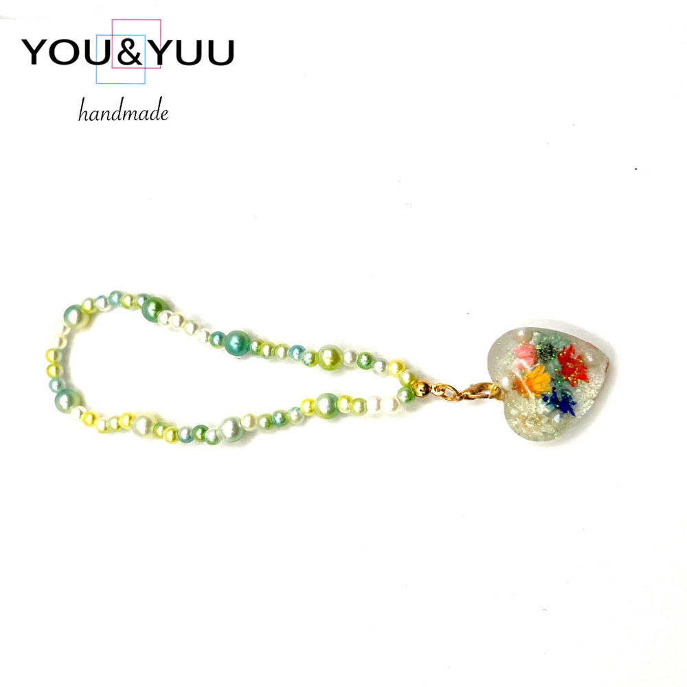 【特長】ハート形にラメ、ドライフラワー、コットンパールを入れて、パールビーズで仕上げました