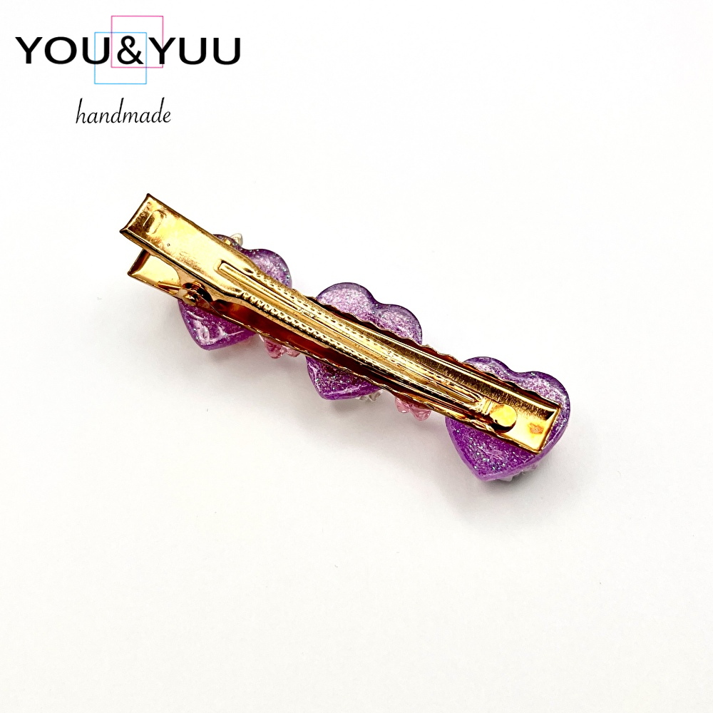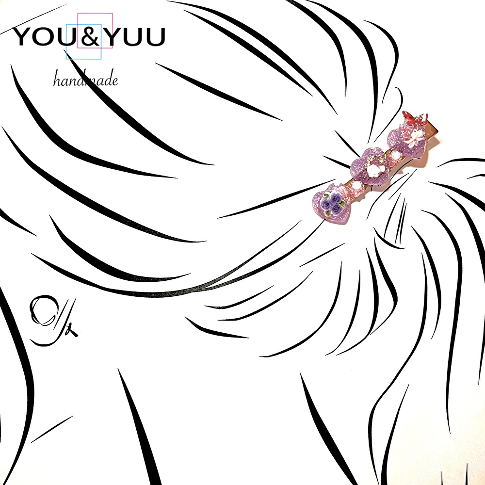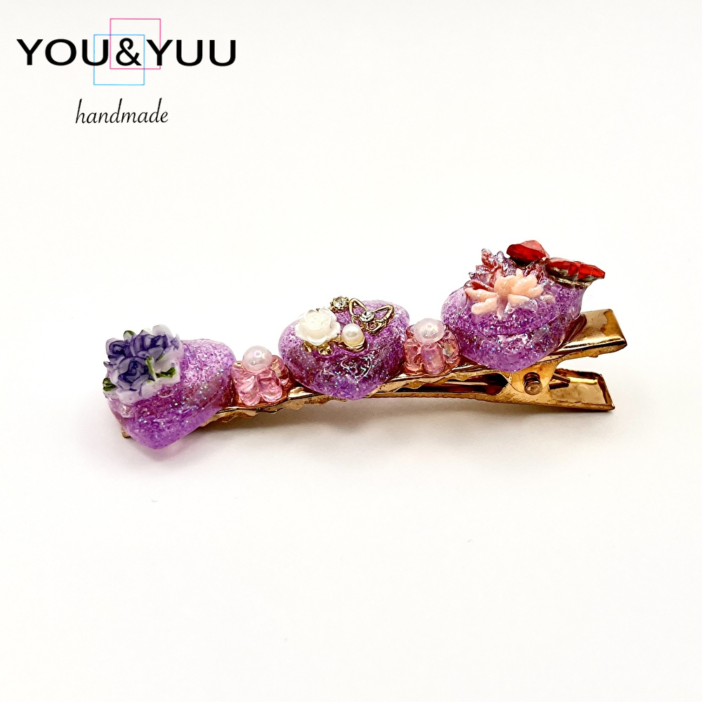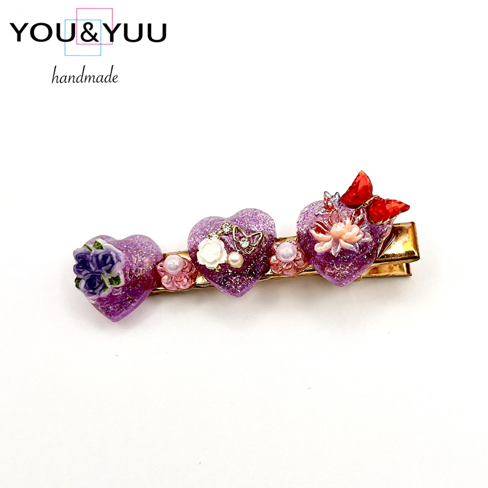 【特長】ハート形にラメを入れて、紫花、ピンク花、ゴールド白バラパーツ。赤い蝶々。ピンク花、ミニパールでデコレーションして作りました