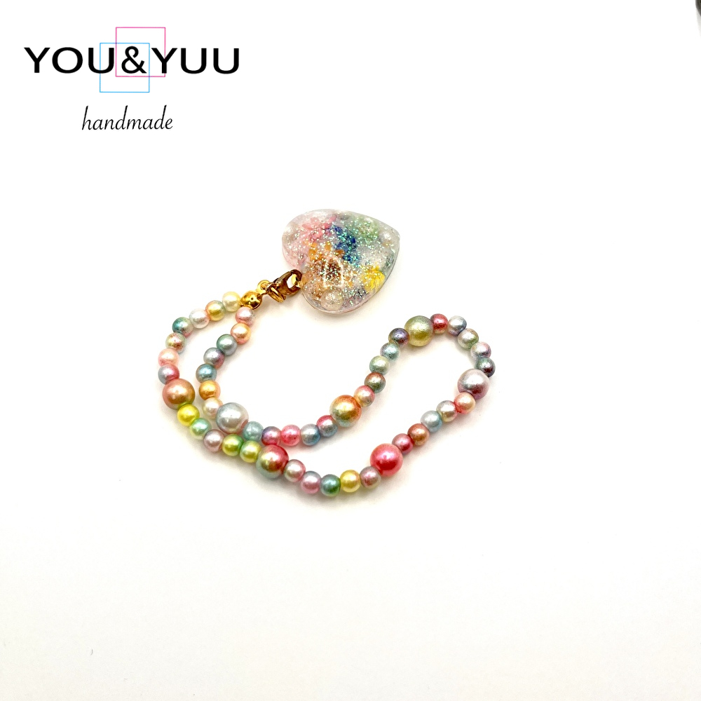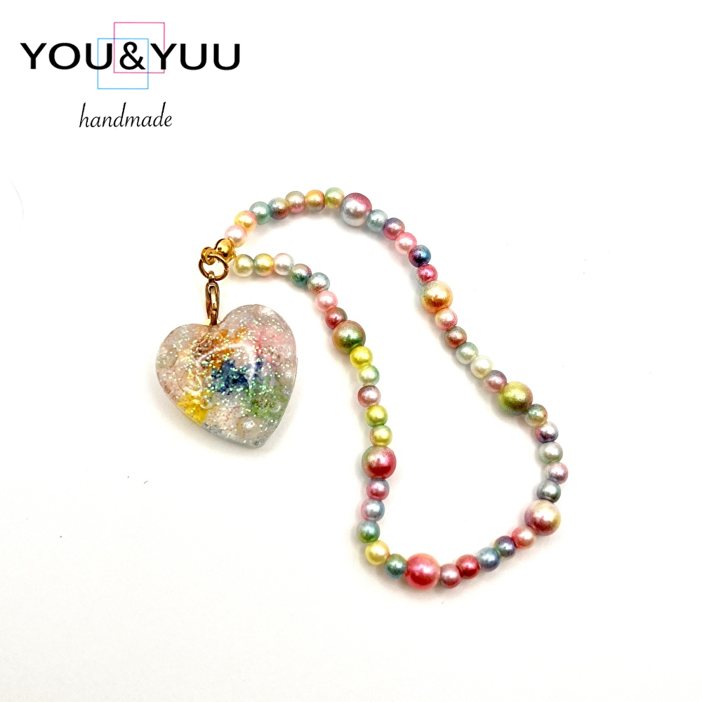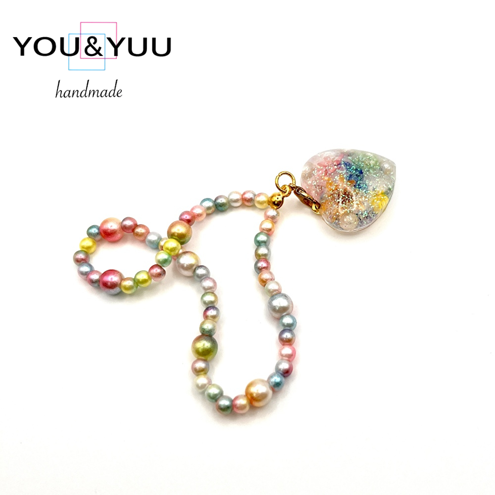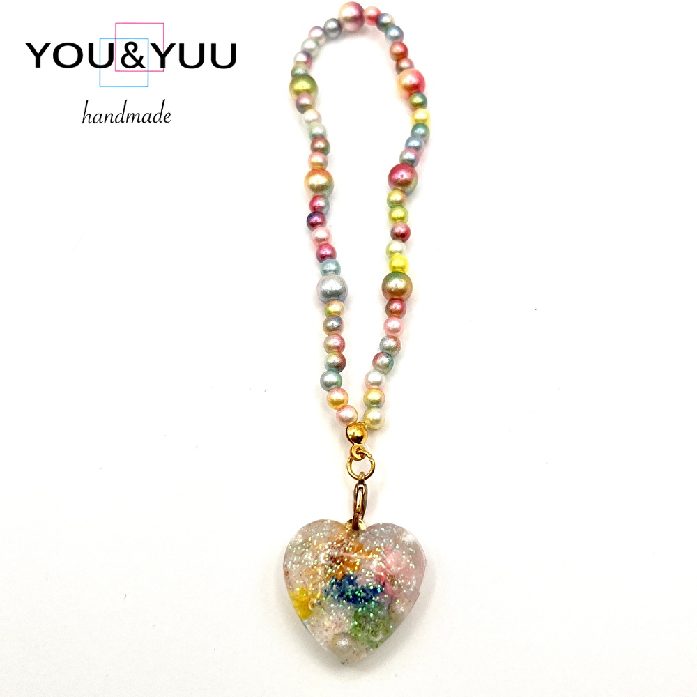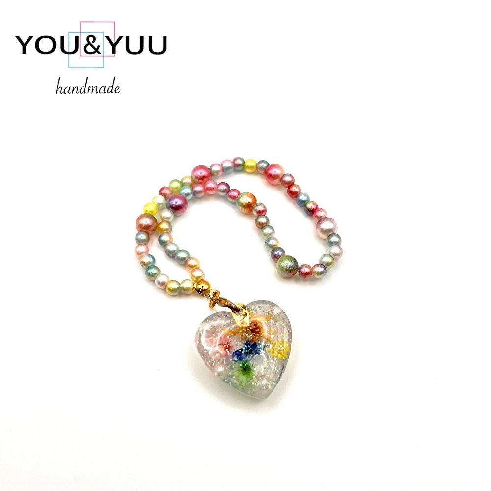 【特長】ハート形にラメ、ドライフラワー、コットンパールを入れて、パールビーズで仕上げました