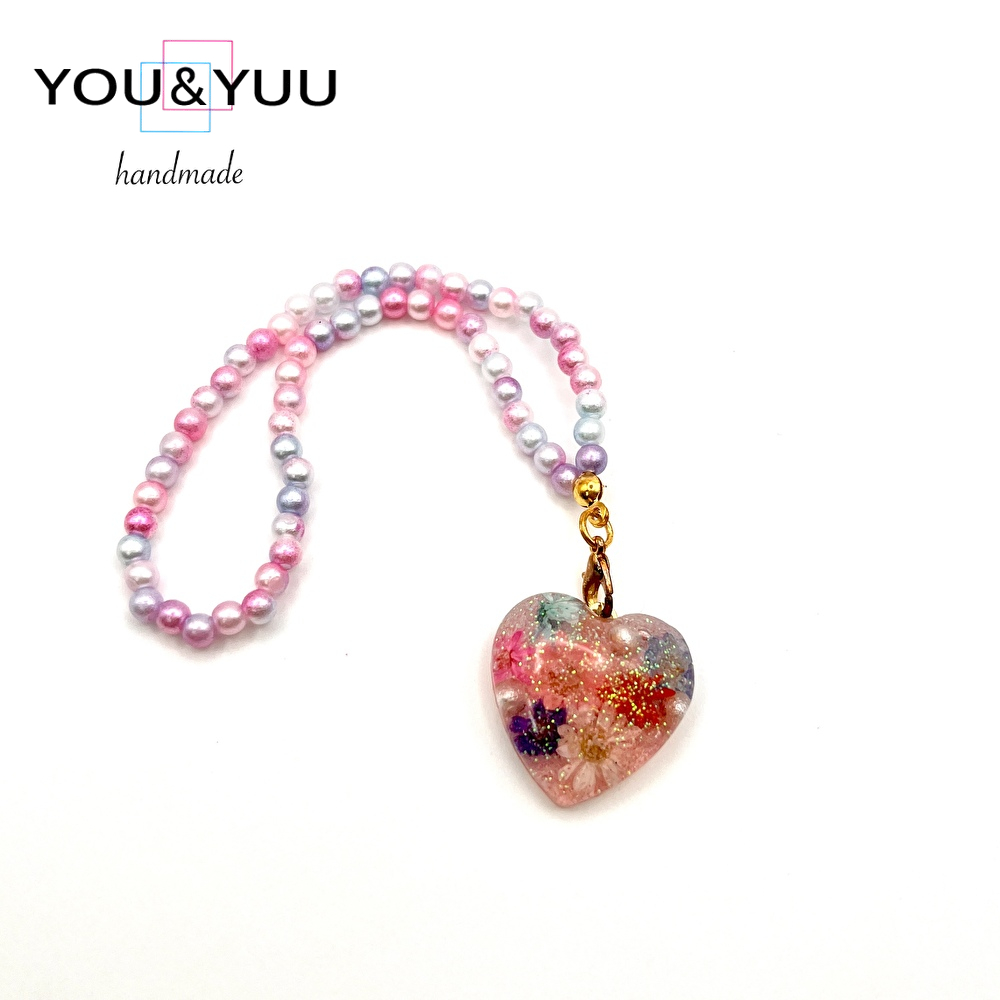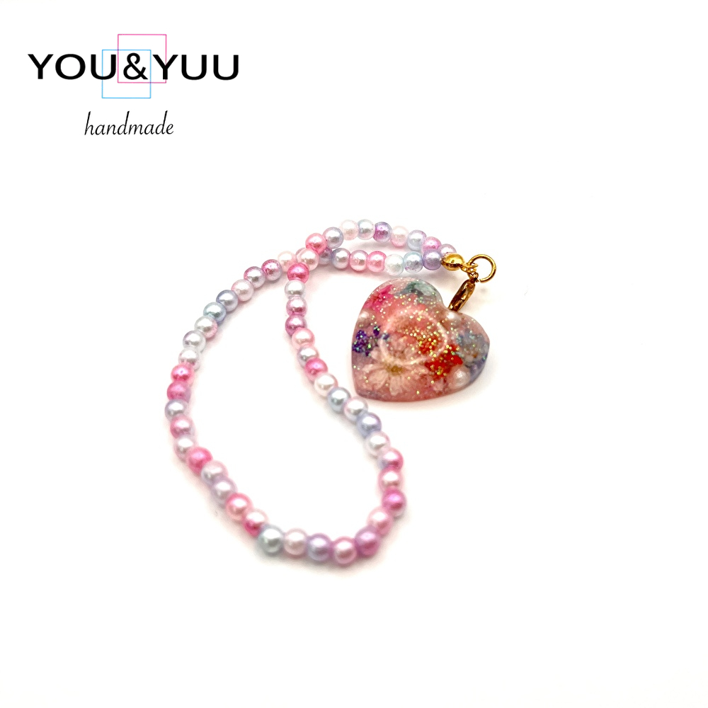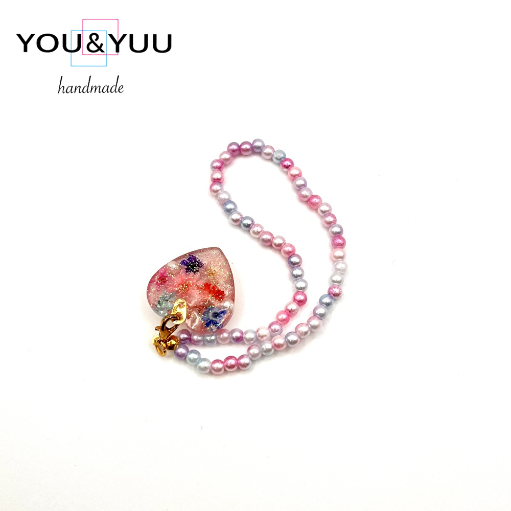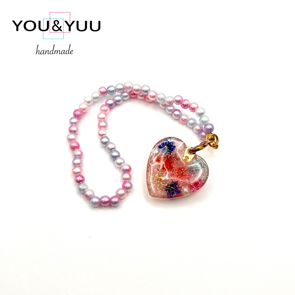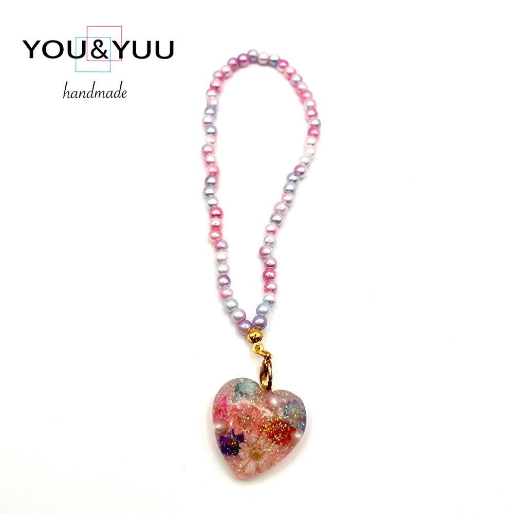 【特長】ハート形にラメ、ドライフラワー、コットンパールを入れて、パールビーズで仕上げました