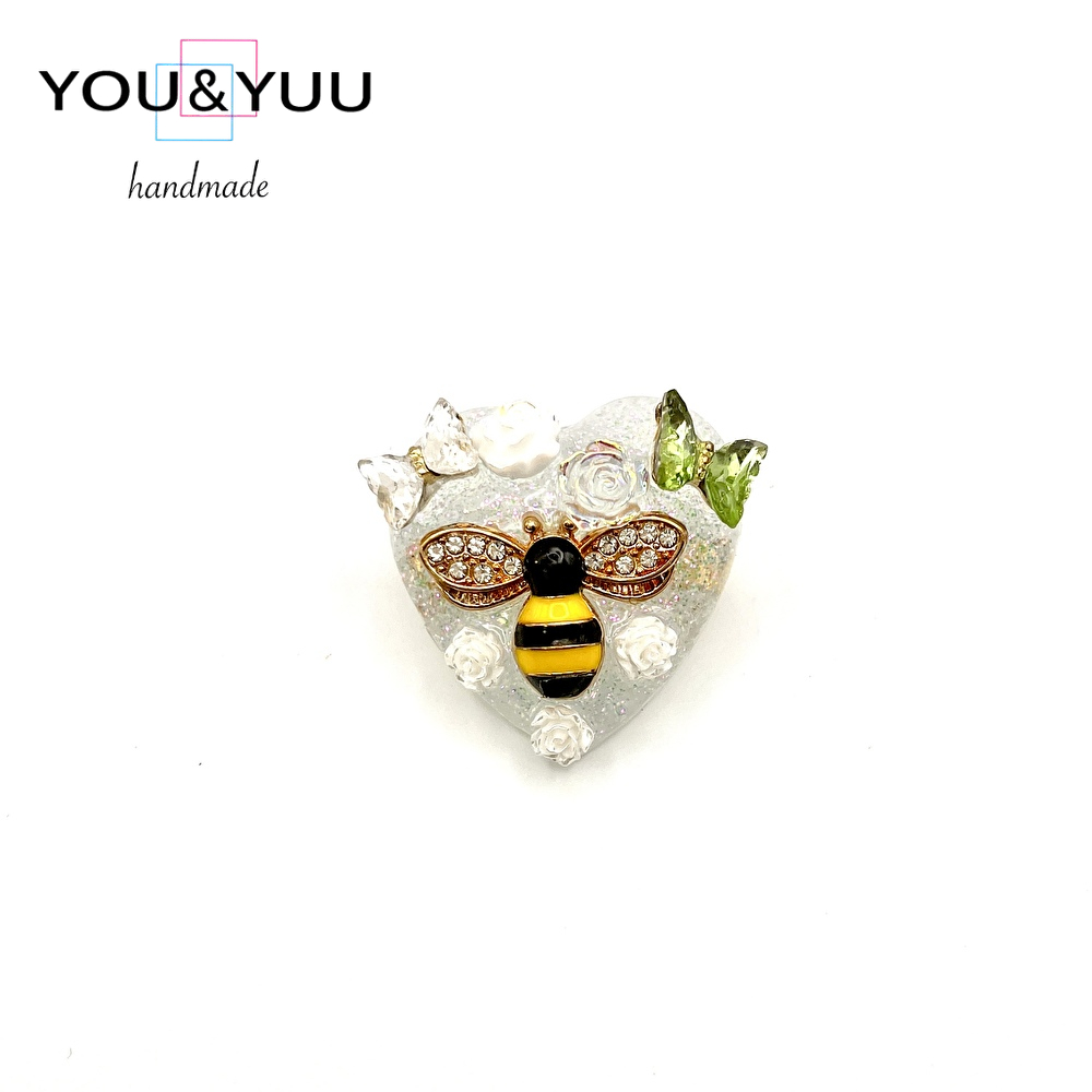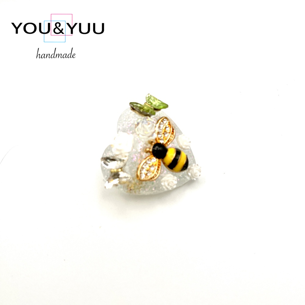 【特長】ハート形にラメを入れて、ミツバチのパーツに、白いバラ、シルバー、グリーンの蝶々のパーツでデコレーションして作りました