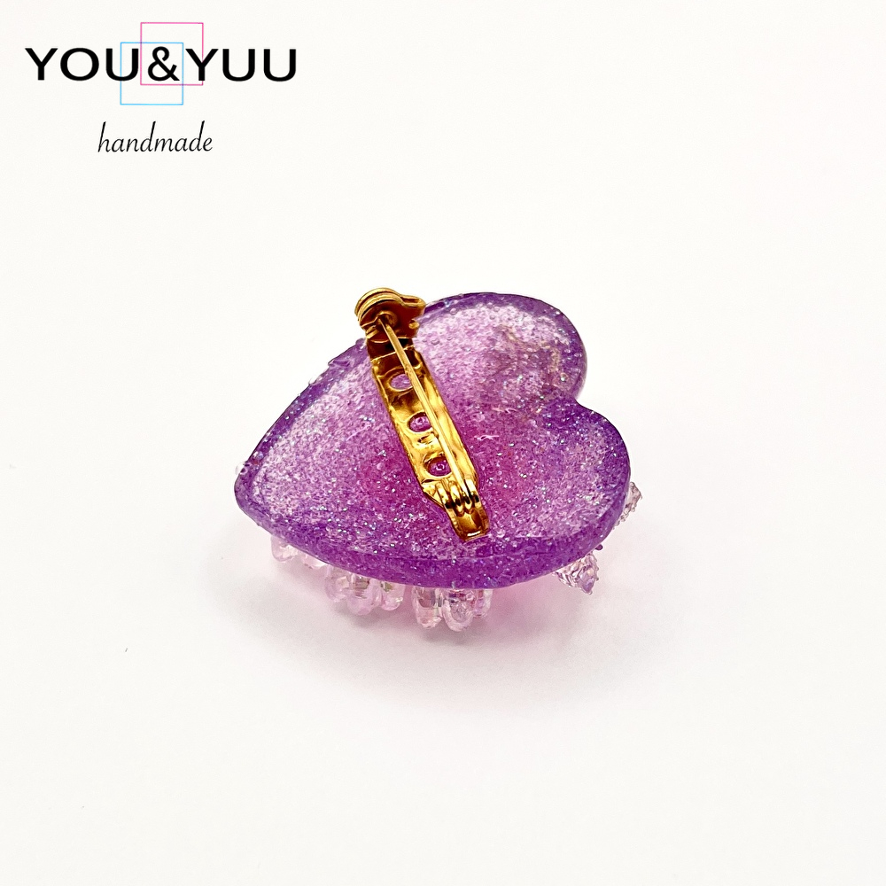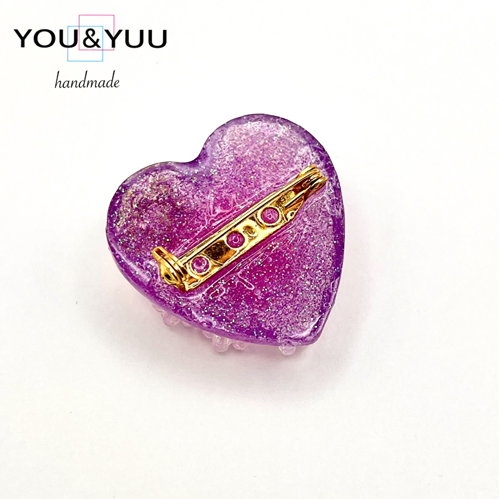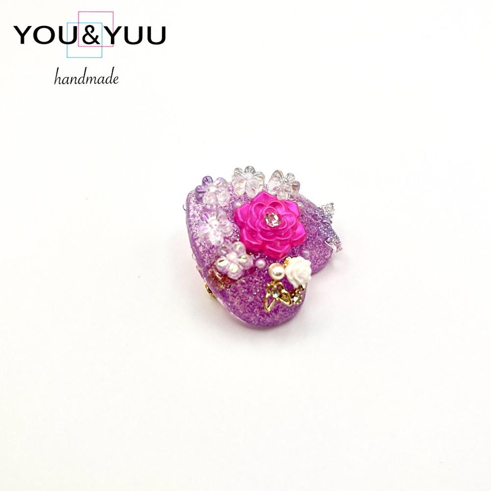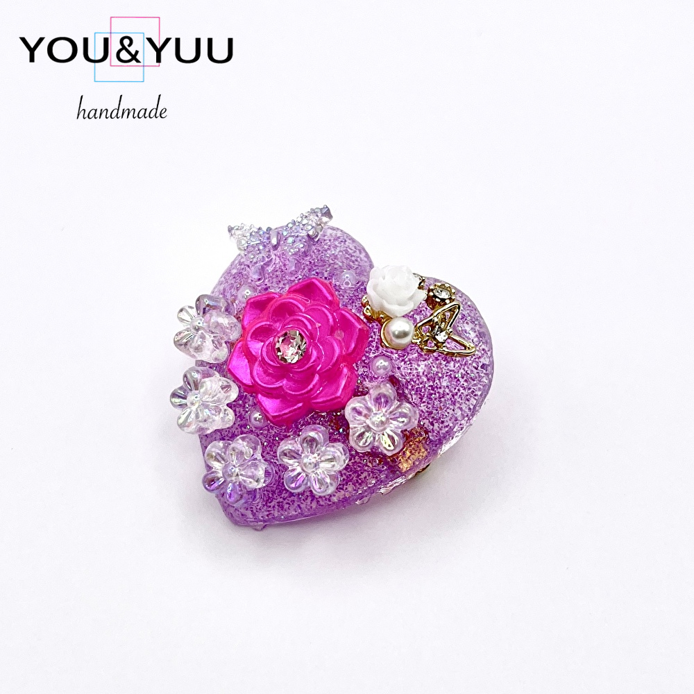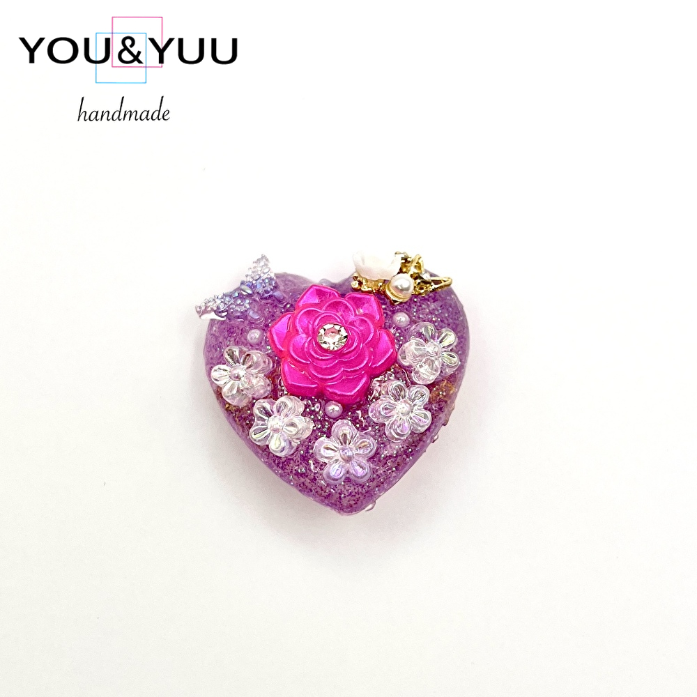 【特長】ハート形にラメを入れて、明るいピンク花のパーツ、キラキラ蝶々、透明花パーツ、ゴールド白バラパーツ、ミニパールでデコレーションして作りました