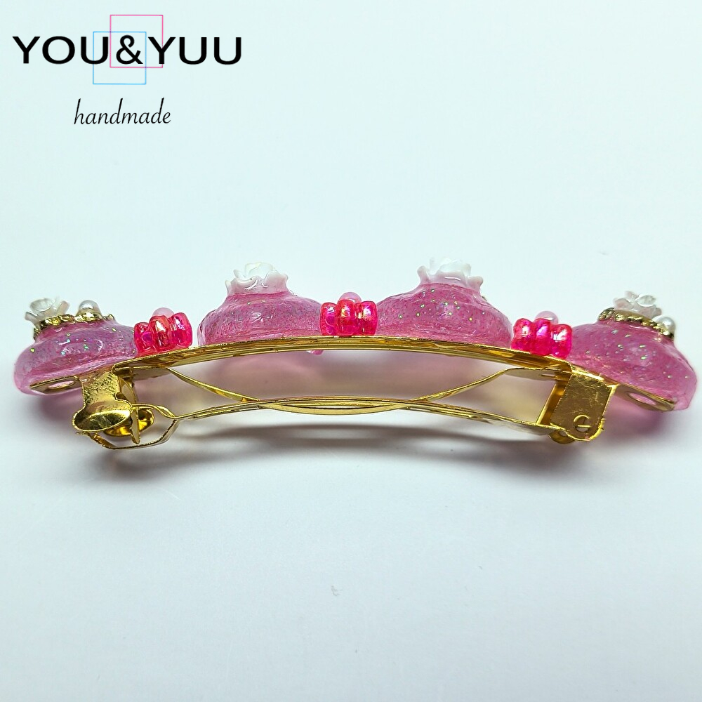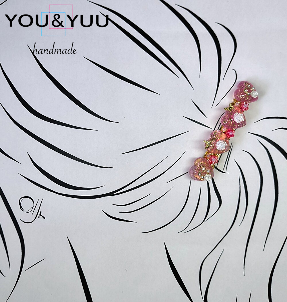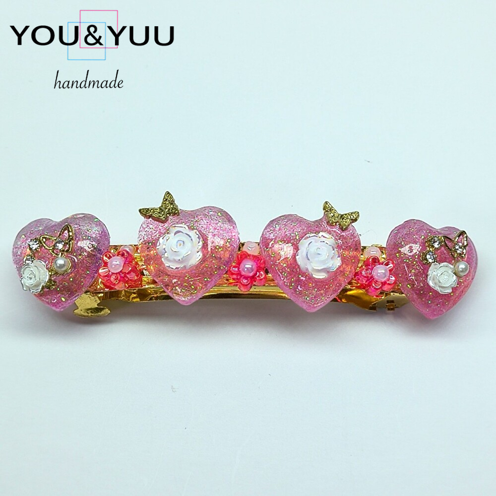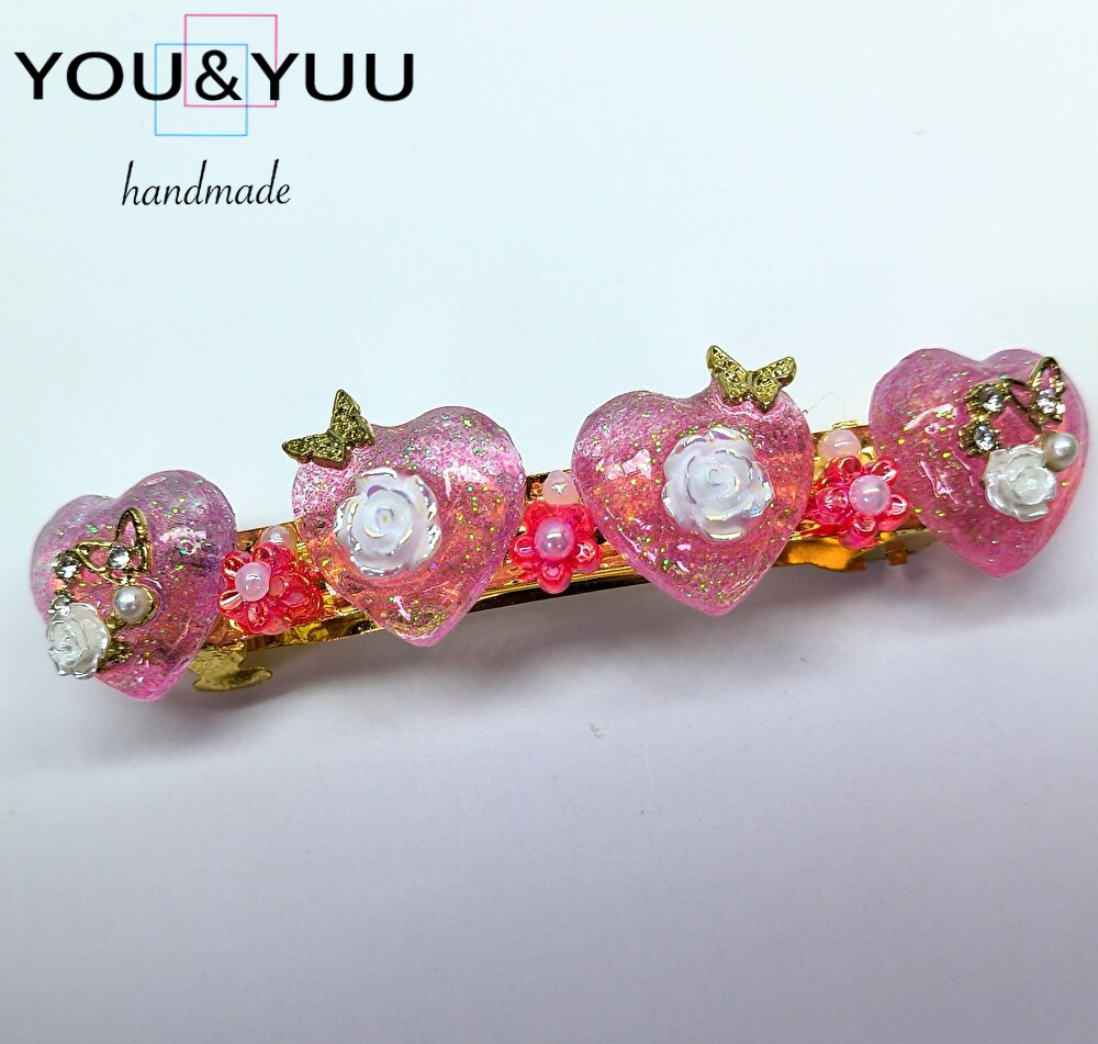 【特長】ハート形にラメを入れて、白いバラのパーツ・ゴールド蝶・ミニバラ・パールのパーツ・ピンクの花のパーツ・ミニパールでデコレーションして作りました。